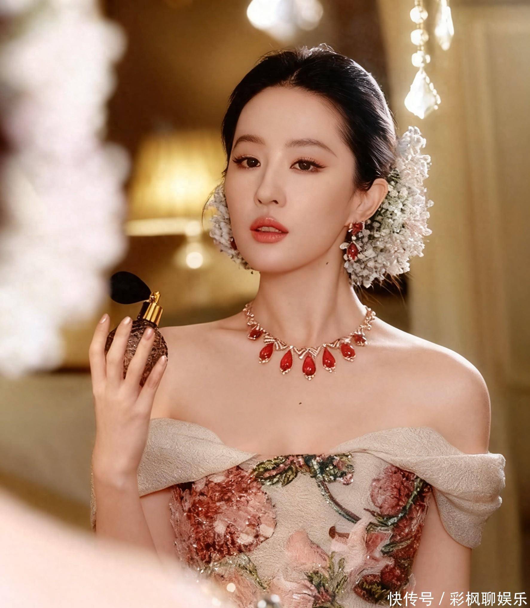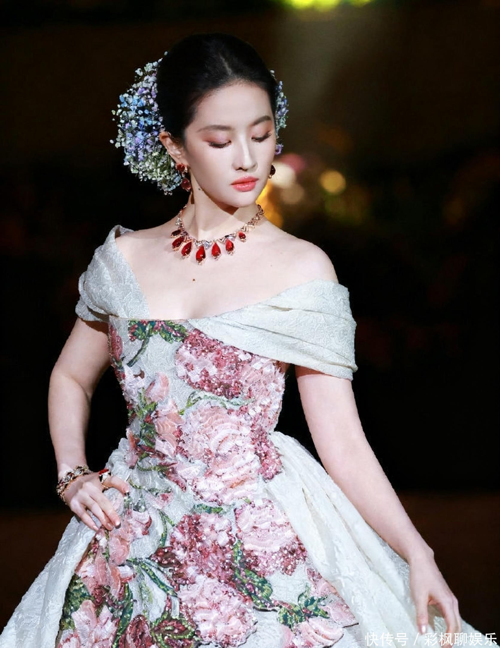 刘亦菲作为压轴登场的巨星,她的亮相无疑是全场焦点。一袭米色长裙上,粉色花朵刺绣栩栩如生,颈间与耳畔的红宝石珠宝流光溢彩,搭配缀满满天星的银色头饰,将华贵与仙气完美融合。从群封C位到红毯压轴,她用稳定的气场诠释着顶级巨星的风范。